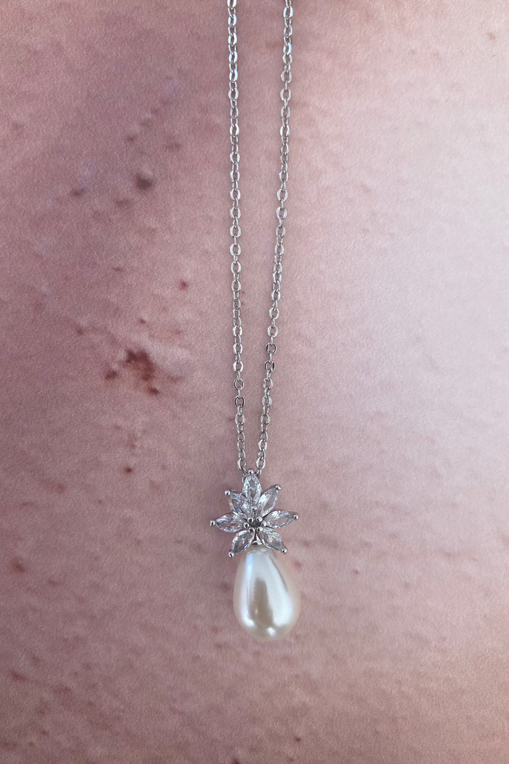 Hermoso collar con colgante de perla sintética en forma de gota y circonia de la mejor calidad. La cadena está bañada en rodio platinado