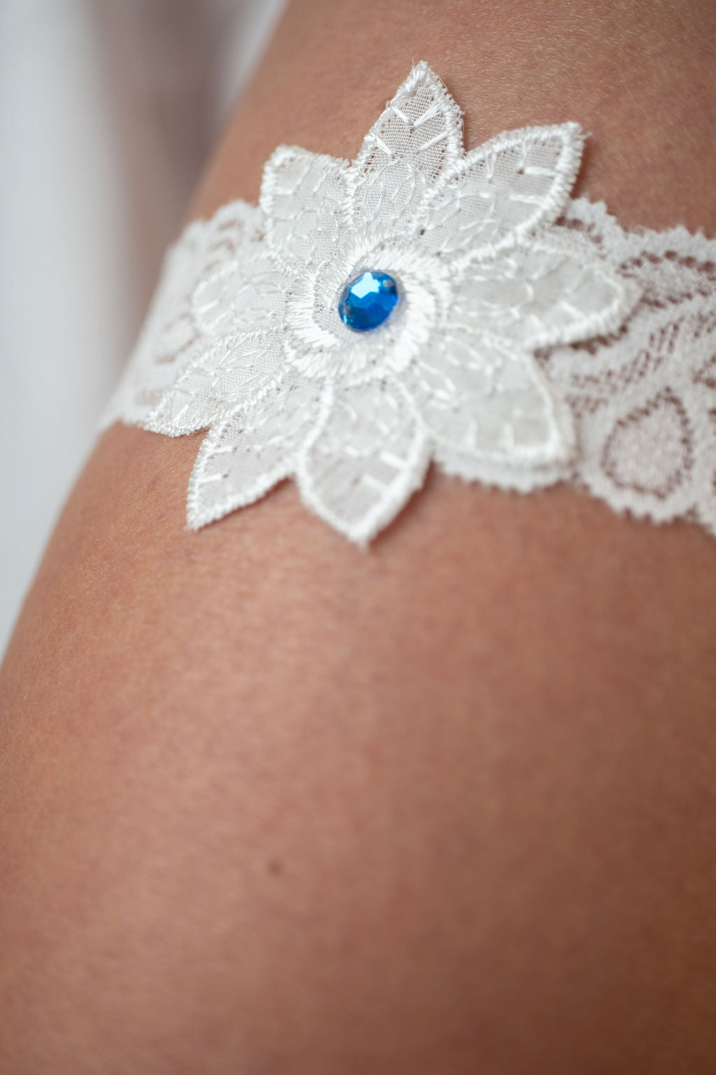 Hermosa liga de encaje spandex con detalles en pedrería azul.