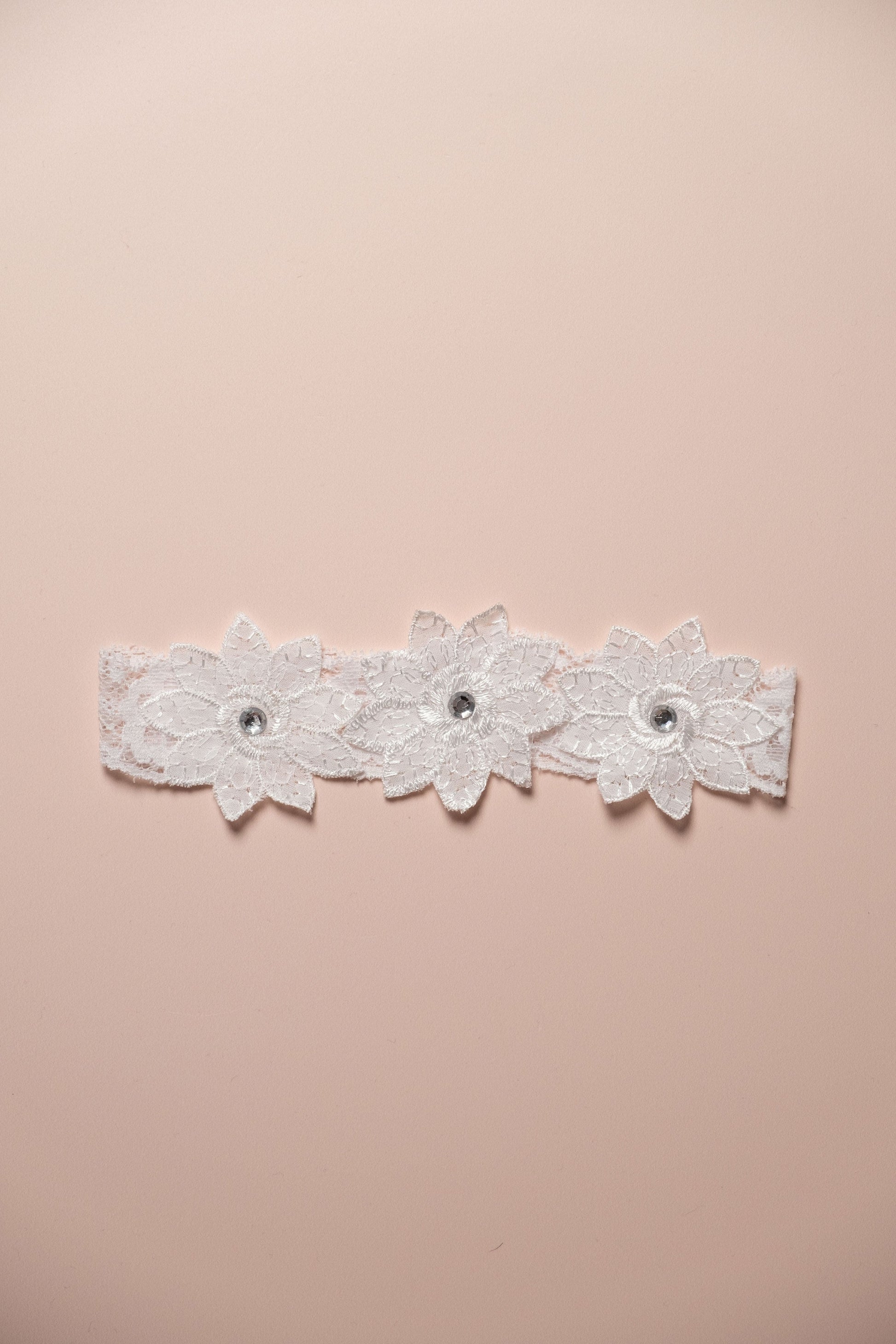 Hermosa liga de encaje spandex con hojas de tela razo y pedrería.