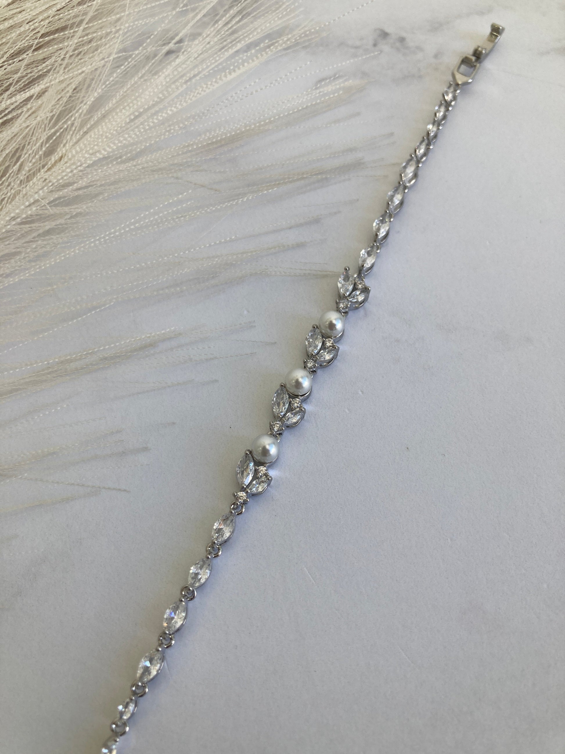Hermosa pulsera elaborada en circonia de excelente calidad, perlas sintéticas y baño de rodio platinado.
