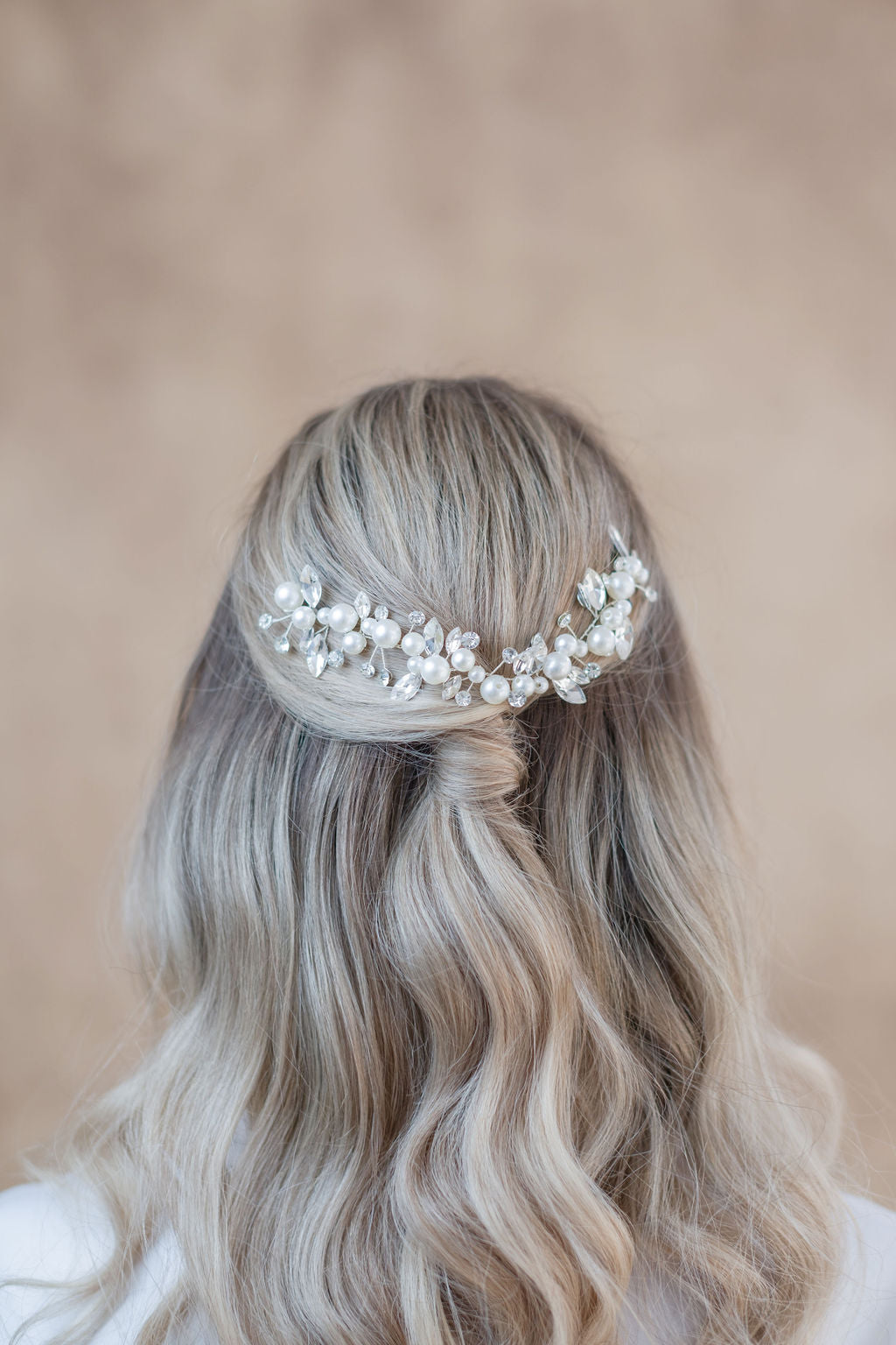 Delicado tocado tipo guía flexible con decoración de perlas sintéticas